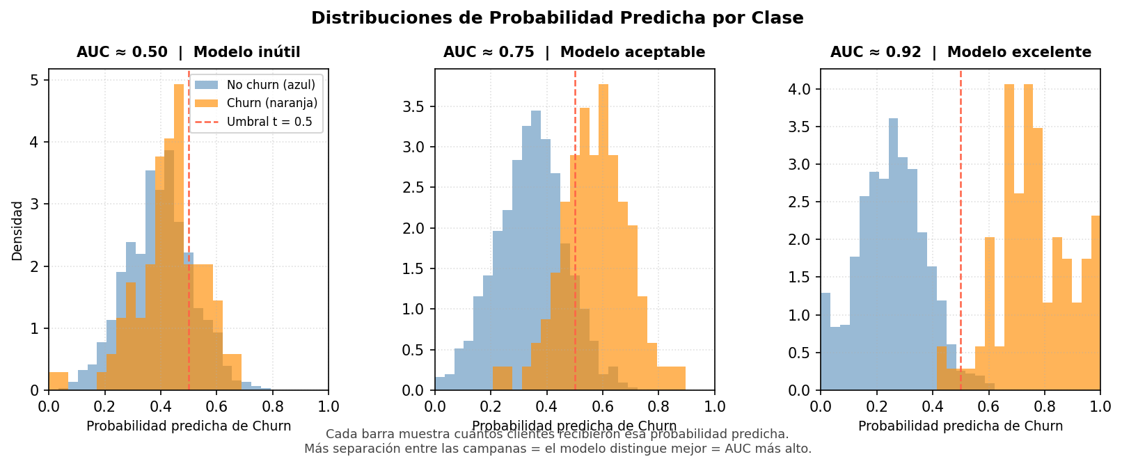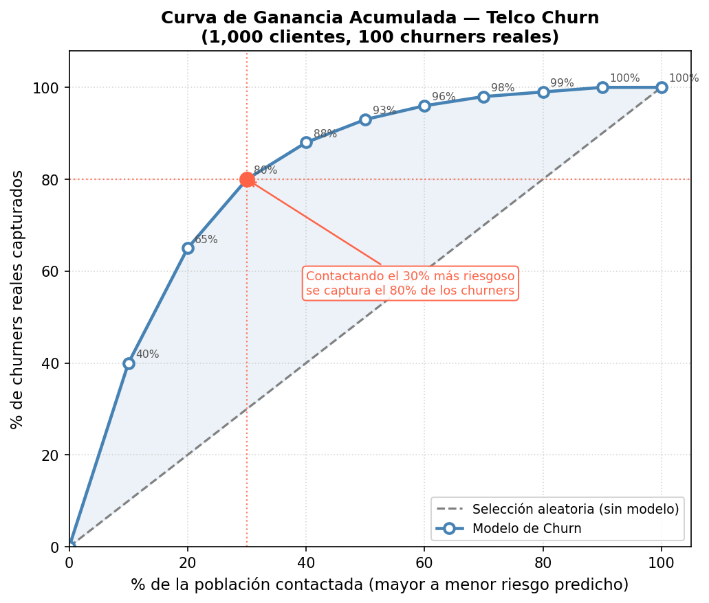 Lectura práctica: Si contactamos solo al 30% más riesgoso (los tres primeros deciles), capturamos el 80% de todos los churners. Si eligiéramos clientes al azar, necesitaríamos contactar al 80% de la base para lograr lo mismo.