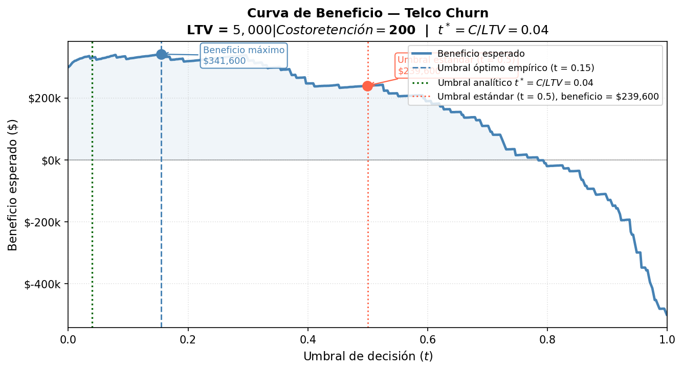 El umbral óptimo casi nunca es \(t = 0.5\). En contextos donde el LTV es muy alto relativo al costo de retención, el umbral óptimo suele ser más bajo (más agresivo), porque vale la pena asumir más FP para no perder churners.