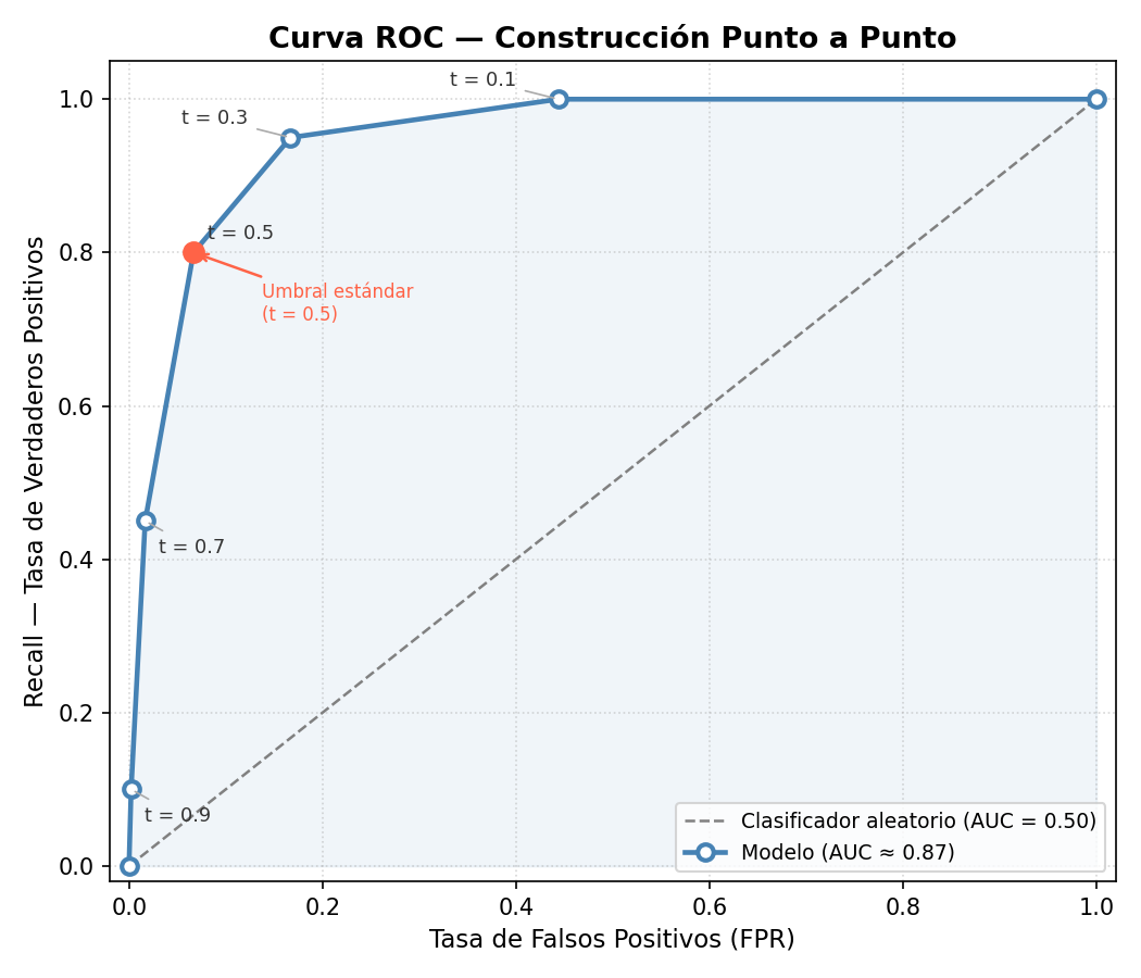 - Eje X: Umbral \(t\) (de 0 a 1)