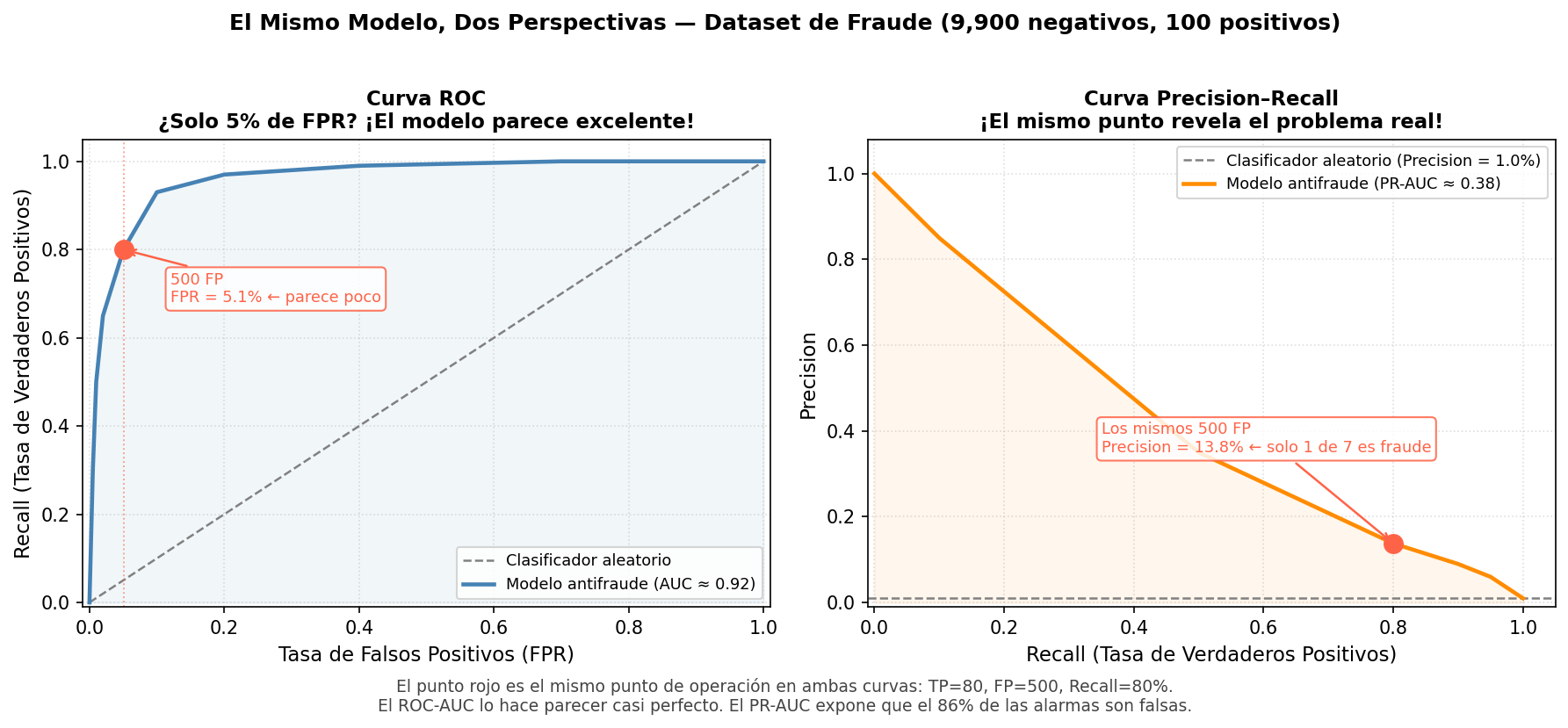 El resultado es un modelo con 99.9% de exactitud que no detecta un solo fraude. Es el peor modelo de detección de fraude posible, y aun así la métrica de Accuracy lo hace parecer excepcional.
