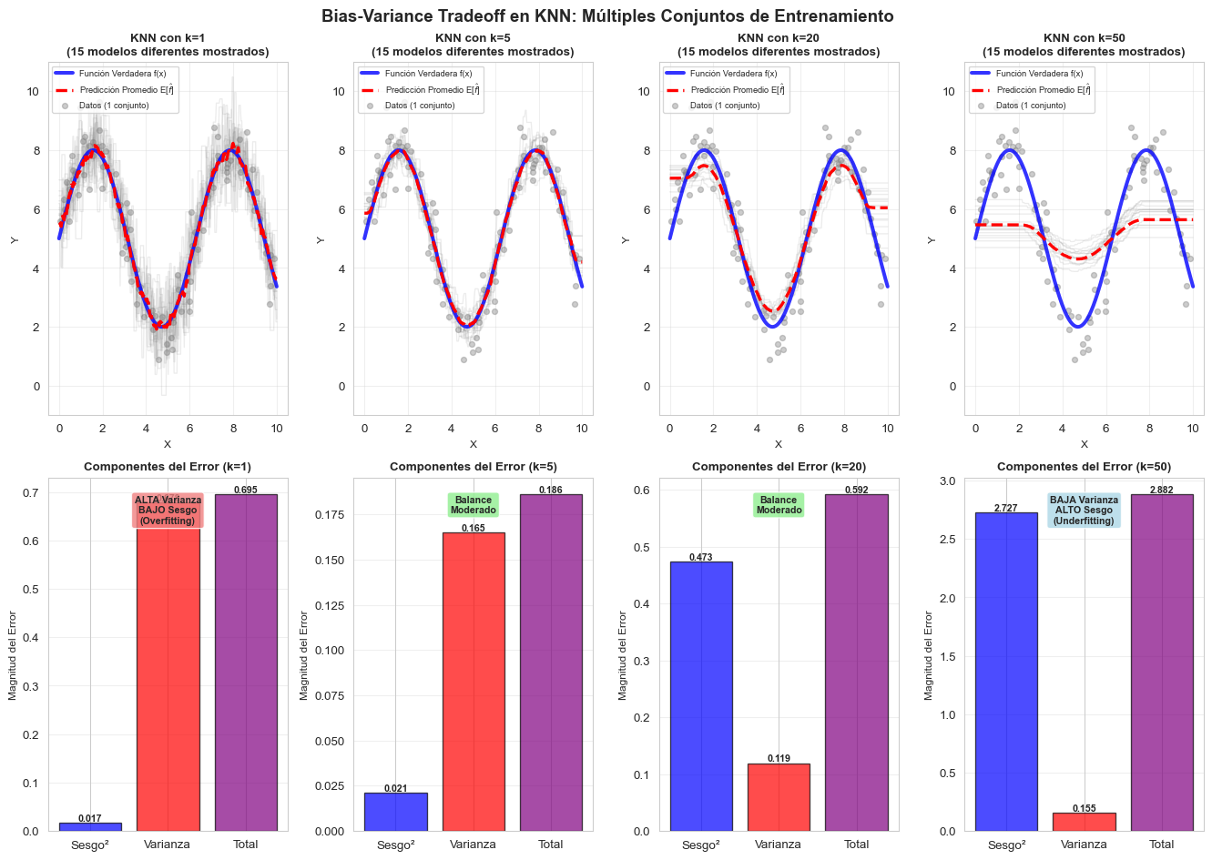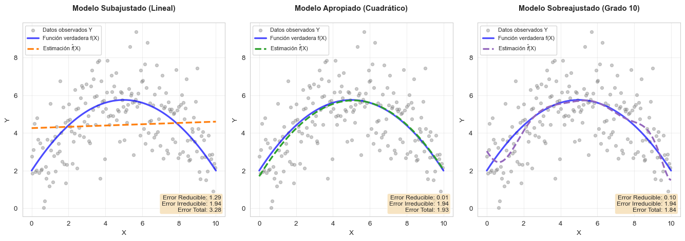 - Datos observados (puntos grises): \(Y = f(X) + \epsilon\), muestran dispersión debido al error irreducible