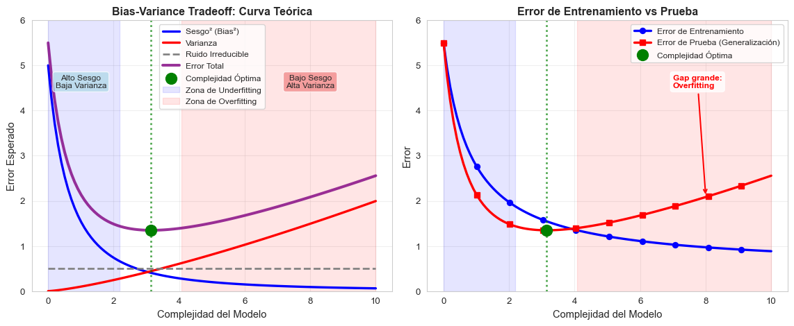 - Error de Entrenamiento (azul): Siempre disminuye con más complejidad