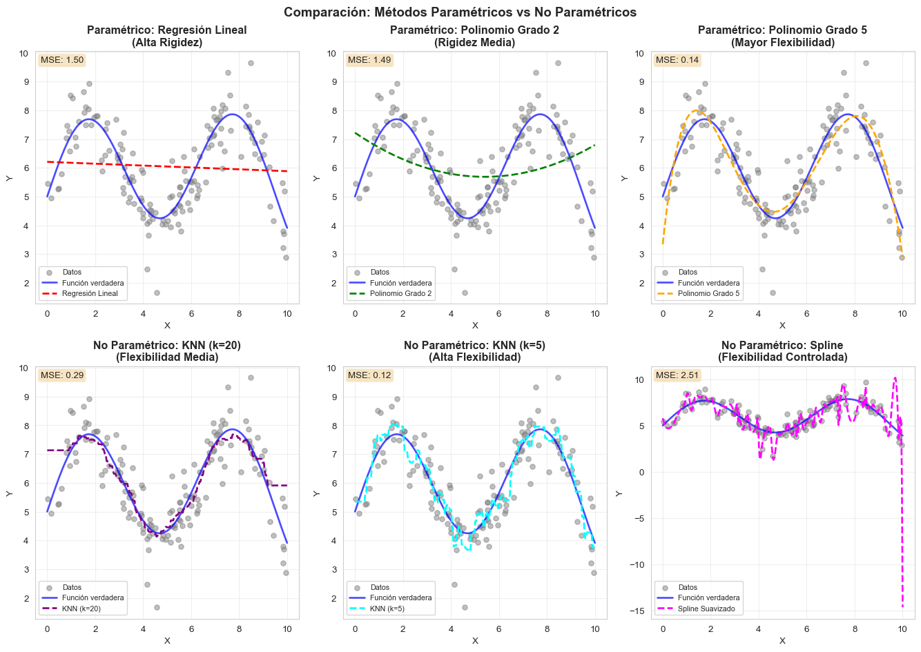 - Si la relación verdadera entre \(X\) y \(Y\) es altamente no lineal y compleja, los métodos paramétricos pueden estar muy sesgados