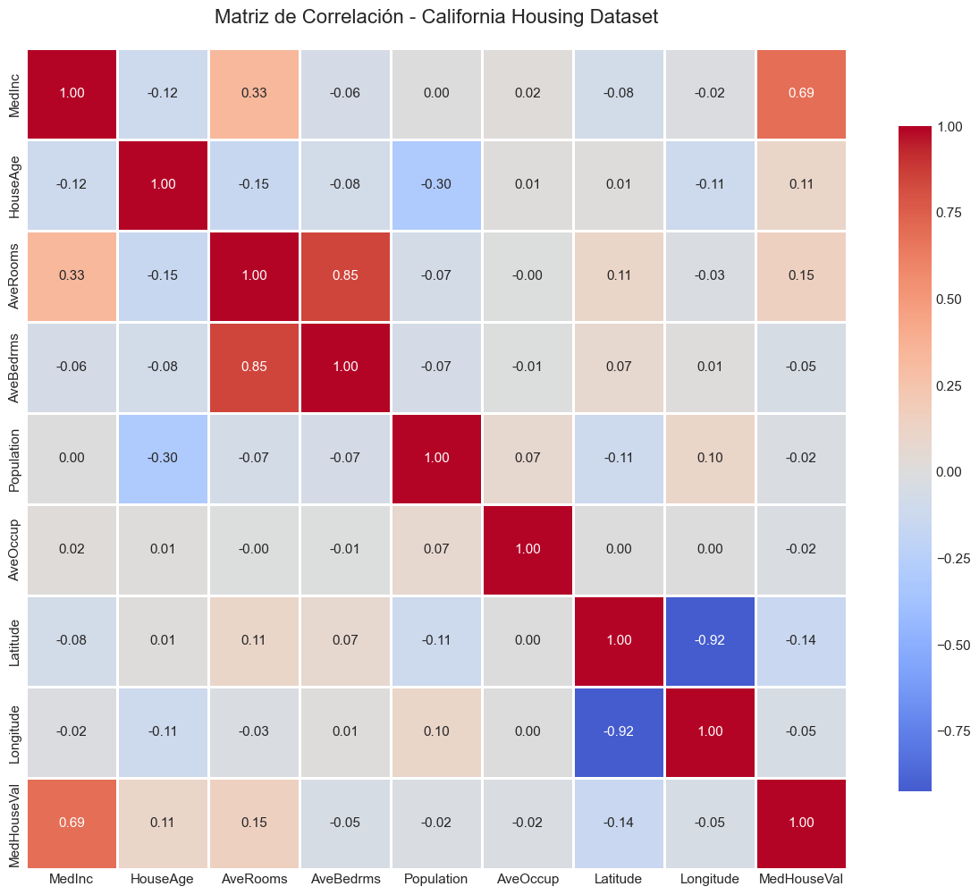 # Cargar el dataset de California Housing# as_frame=True nos devuelve un DataFrame de pandas en lugar de arrays numpyhousing_data = fetch_california_housing(as_frame=True)# Crear DataFrame con características y targetdf = housing_data.frameprint("Dataset cargado exitosamente!")print(f"Dimensiones del dataset: {df.shape}")print(f"Número de observaciones: {df.shape[0]:,}")print(f"Número de características: {df.shape[1] -1}")