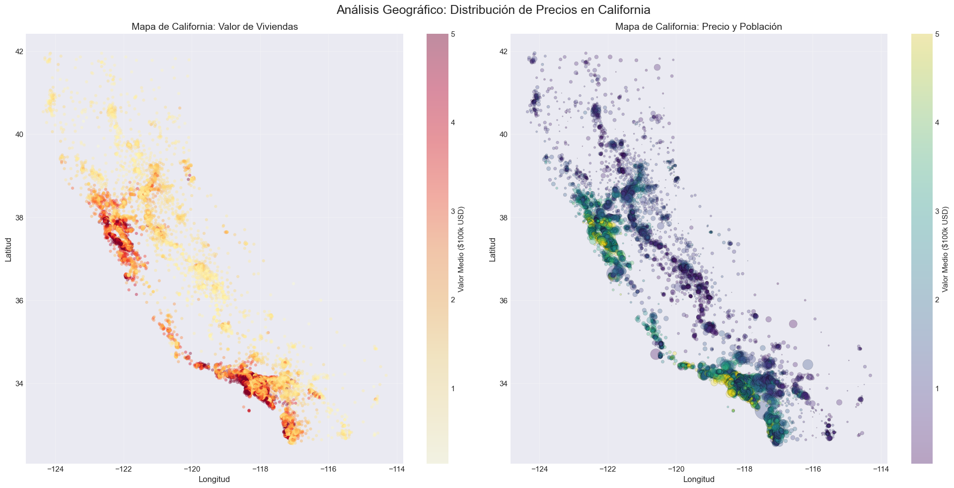 En este caso de estudio completo, abordaremos un problema real de predicción de precios de vivienda utilizando el dataset California Housing del censo de California de 1990. Este ejemplo integra todos los conceptos vistos en el curso: desde el análisis exploratorio hasta la comparación de múltiples algoritmos de aprendizaje automático.