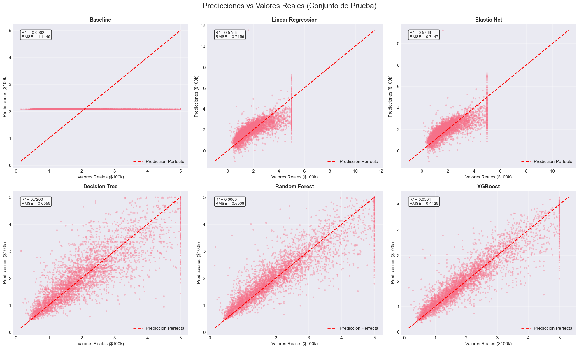 XGBoost gana en precisión: R² = 0.85, RMSE = $44,280